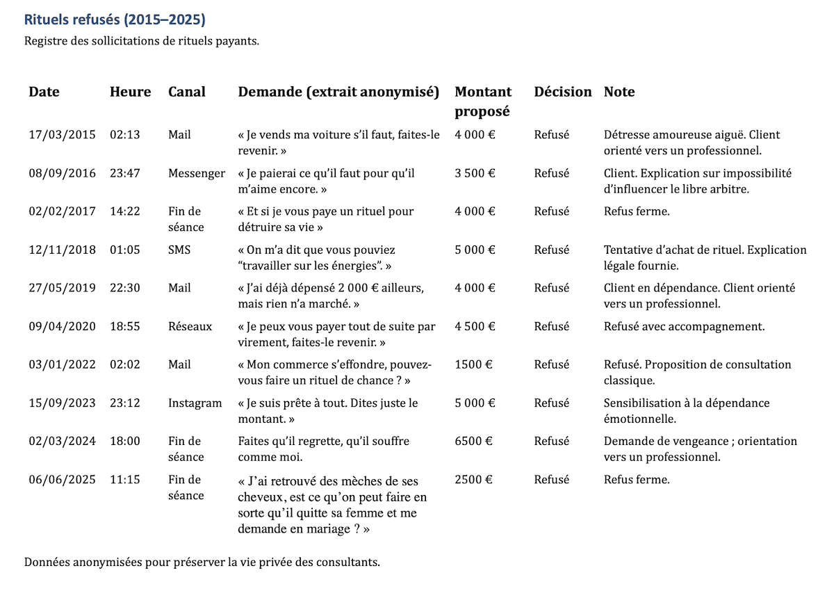 Note : une sollicitation de rituel est une demande explicite d’intervention payante visant un résultat surnaturel (retour affectif, ouverture de chemin, protection, etc.).